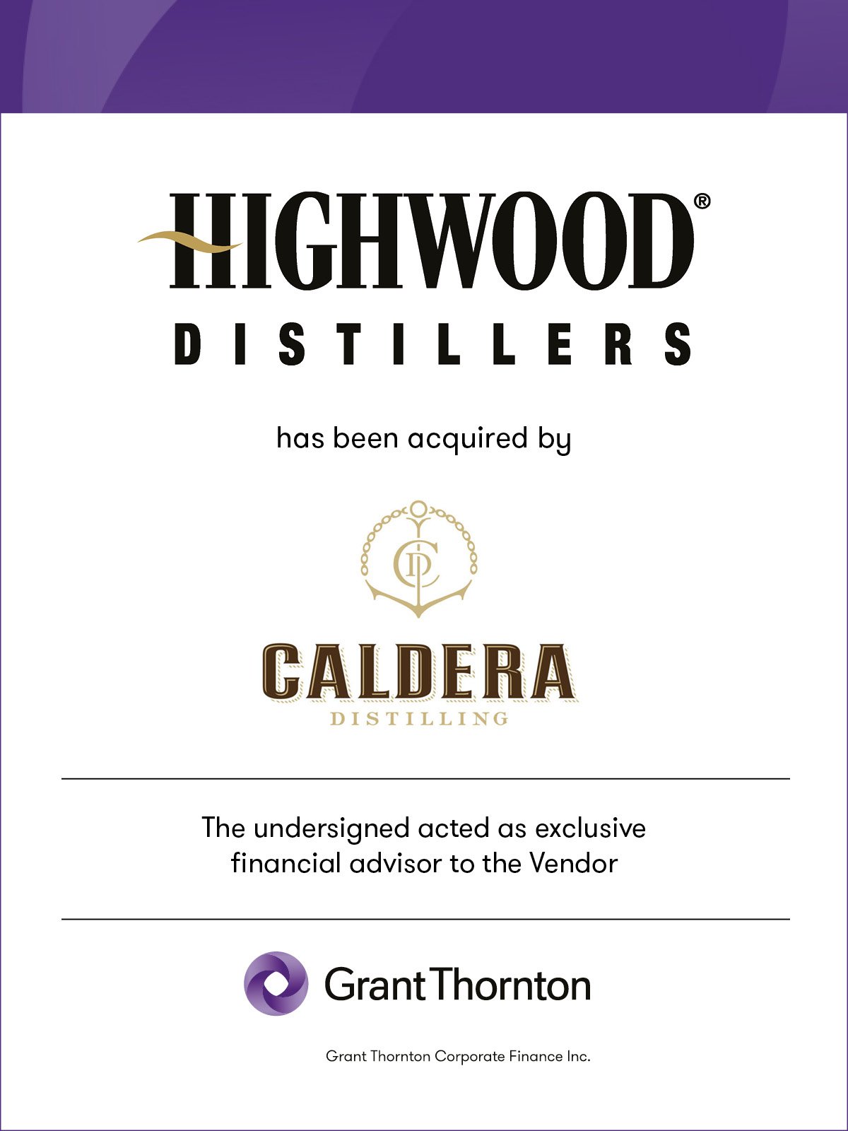 Caldera Distilling is a farm-to-bottle distillery, known for producing award-winning hand-crafted whiskies that are distilled, barreled, aged, and bottled, in River John, Nova Scotia. Our team guided shareholders at Highwood through each step of the sales process to Caldera while driving the value of the deal.